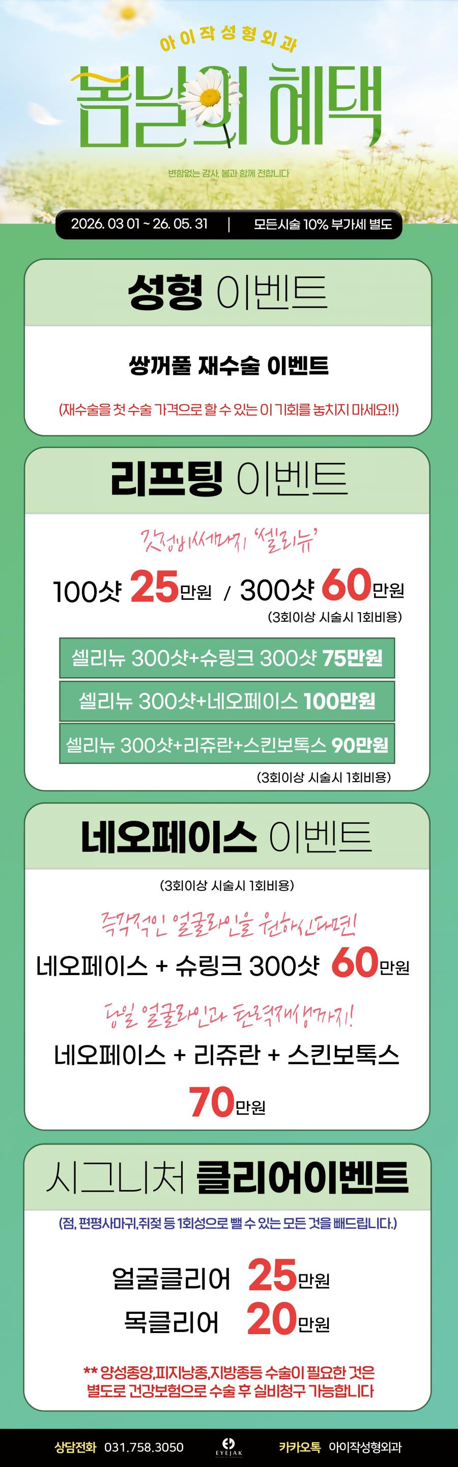 | 공지 | 26년 아이작성형외과 봄이벤트 소개! | 관리자 | 2026.03.01 | 565 |